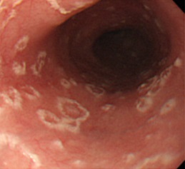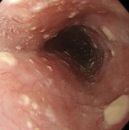 En las esofagitis fúngicas, la imagen endoscópica típica consiste en placas blanquecinas y mucosa friable.